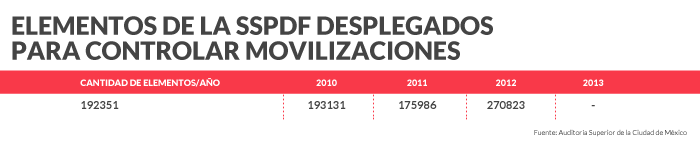 De acuerdo con el informe de la Auditoría capitalina, el “control” de plantones, mítines y marchas es la actividad en la que la SSPDF despliega el mayor número de elementos, por encima de otras actividades como el rastreo y desactivación de artefactos explosivos, operaciones ribereñas y patrullajes en zonas agrestes, ecológicas y pueblos, o como escolta a visitantes distinguidos.